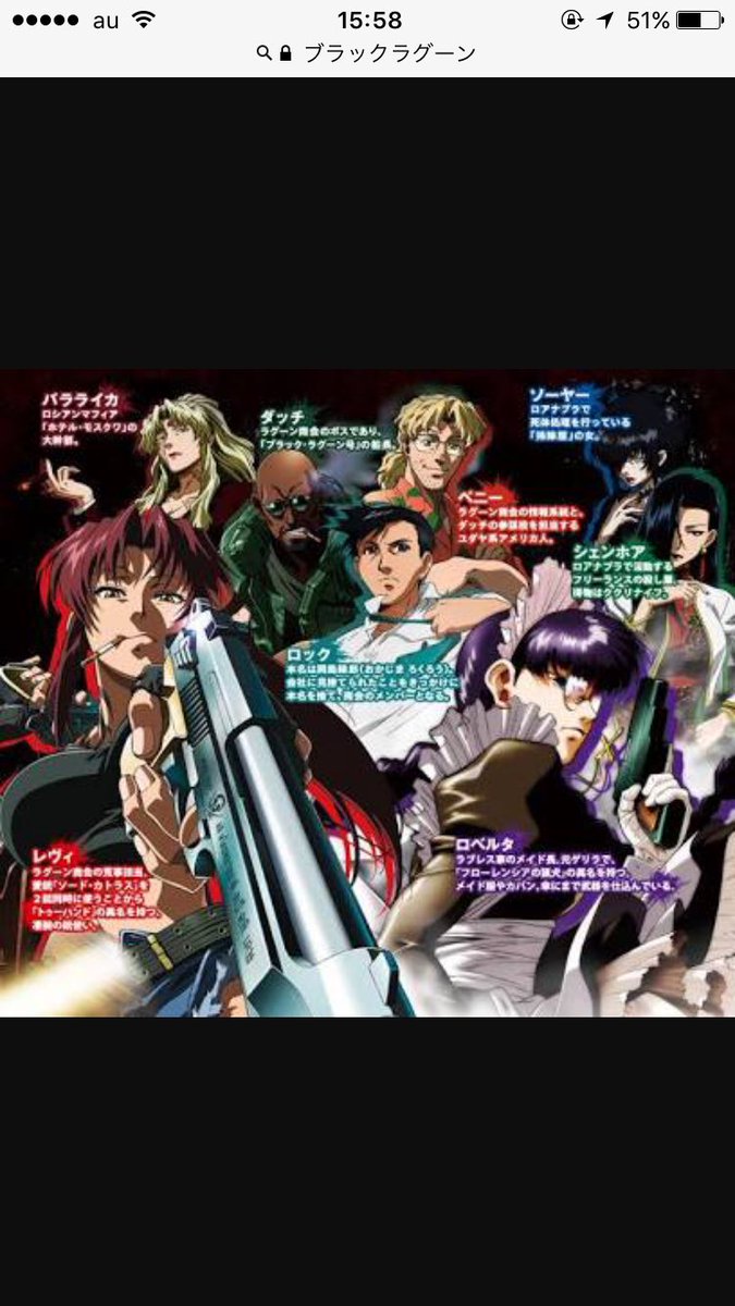 ブラックラグーン フライフェイス レヴィ ロベルタ ロック 姐御 大尉 ソビエト社会主義共和国連邦 別作品の似たような方々 インテグラル・ファルブルケ・ウィンゲーツ・ヘルシング『ブラック・ラグーン2 罪深き 魔術師 ( ウィザード ) の 哀歌 ( バラード ) 』11年1月18日発売 、 isbn テレビアニメ これまでに2つのシリーズを連続テレビアニメとして全24話制作、 独立局 を中心とした各局で放送(当時の言い方だと「 UHFアニメ 」)。ブラックラグーンBLACK LAGOON オフィシャルページ @lagoon_revy からのツイート NEW 「BLACK LAGOON Bluray BOX」スペシャルプライス版 発売! 1458 BLACK LAGOON全アニメシリーズ ニコニコ動画で一挙配信決定! ATXにて『BLACK LAGOON Roberta's Blood Trail